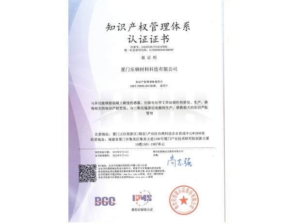 2019年7月,廈門樂鋼材料科技有限公司憑借其知識產權管理體系的規范性、嚴謹性,順利通過了知識產權管理體系認證,并獲得由新世紀檢驗認證股份有限公司頒發的該管理體系認證證書(證書編號:016ZB19EIP1L0167R0S)。在知識產權領域榮獲認可,再次證明了我司的只是產權管理能力、創造能力和企業競爭實力。